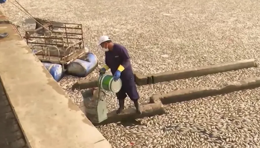 Trabalho para retirada de peixes mortos segue acontecendo no local desde o último domingo (11).