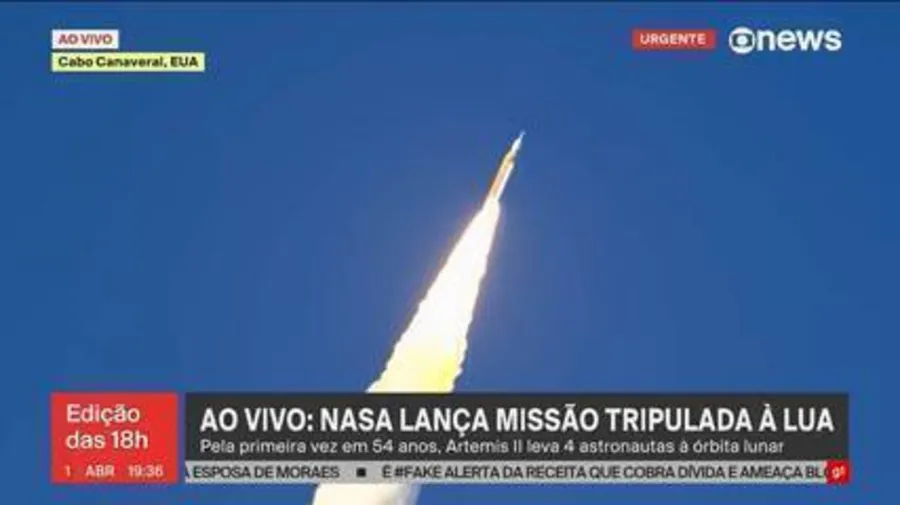 Primeiro de abril de 2026. Por volta das sete e meia da noite, é lançada a Artemis II, a nave que vai orbitar a Lua, 54 anos após o término do Projeto Apollo.