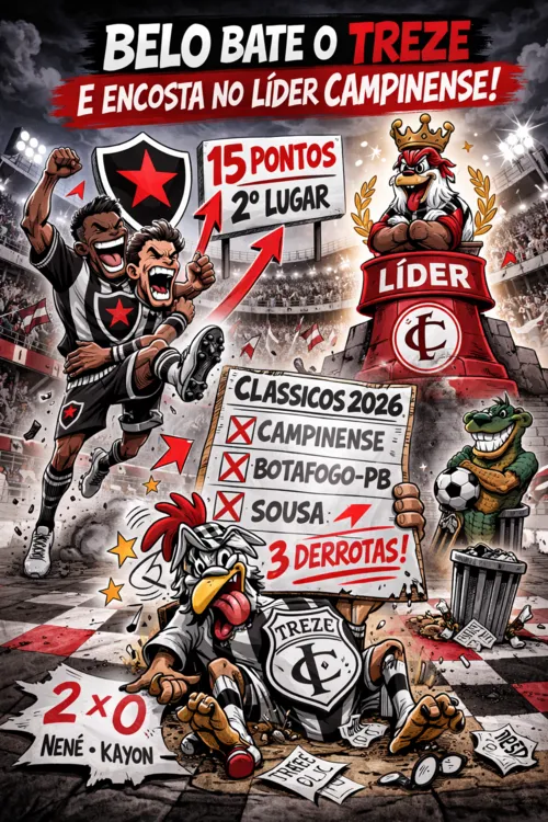 Humor, tecnologia e futebol passam a dividir o mesmo espaço no Jornal da Paraíba, que, a cada rodada, apresentará ao torcedor a Charge do dIA, ilustração produzida por inteligência artificial a partir de um dos principais jogos do Campeonato Paraibano; na edição da vez, a inspiração vem da vitória do Botafogo-PB por 2 a 0 sobre o Treze, que perdeu todos os clássicos até aqui em 2026.